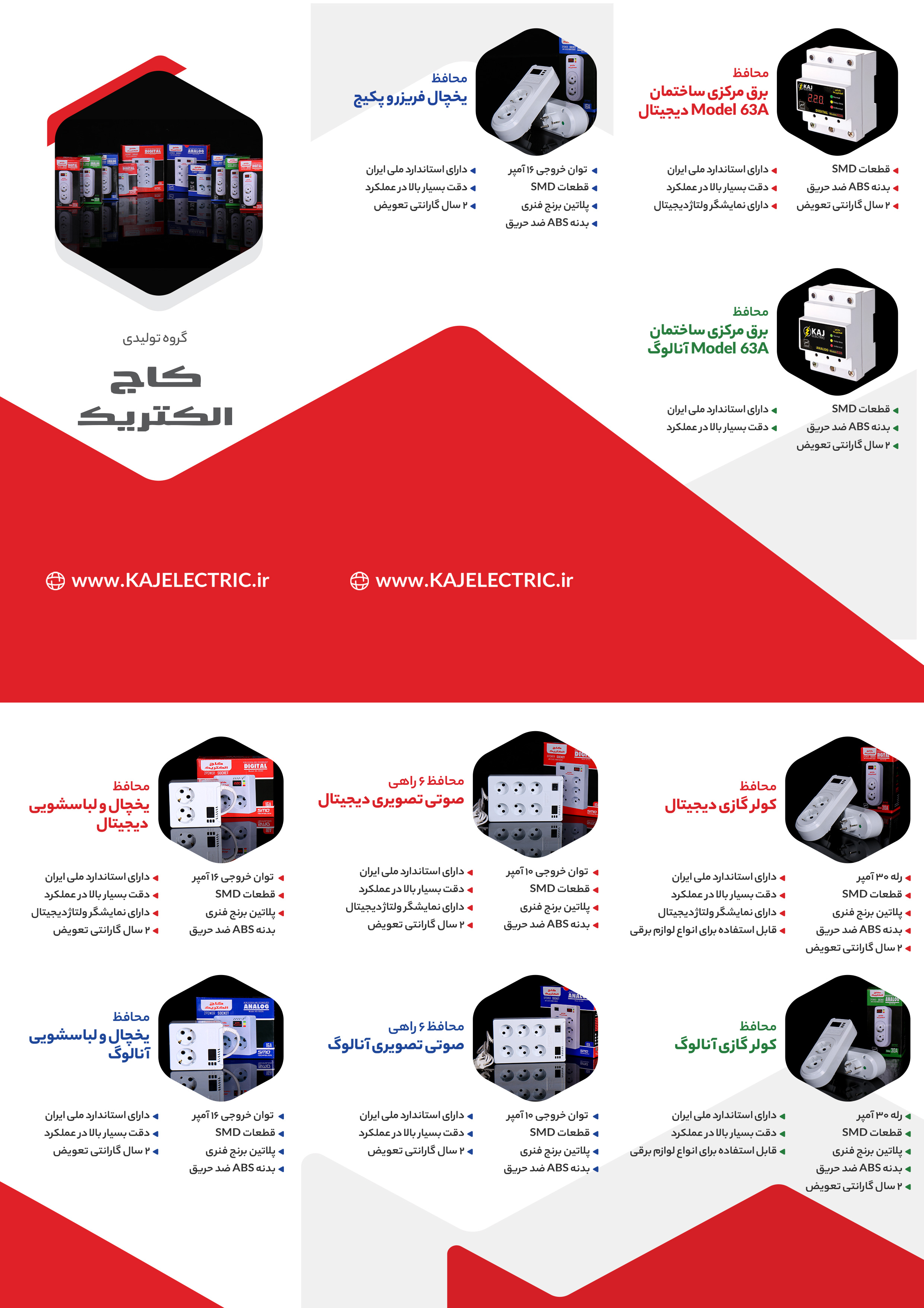 گروه تولیدی کاج الکتریک تولید کننده انواع محافظ لوازم برقی خانگی از جمله کولر،یخچال،ماشین لباسشویی و ظرفشویی،لوازم برقی آشپزخانه و لوازم صوتی و تصویری مانند تلویزیون می باشد و همچنین محصول کاربردی محافظ برق ساختمان که پوشش دهنده ی کلیه لوازم برقی خانگی بوده می باشد. کاج الکتریک در تولید تمامی محصولات خود از با کیفیت ترین قطعات و مواد استفاده نموده و همواره در پشتیبانی پس از فروش از محصولات خود سعی در جلب رضایت حداکثری مشتریان نموده است. محصولات ما را می توانید به صورت آنلاین و سفارش تلفنی خریداری نمایید.